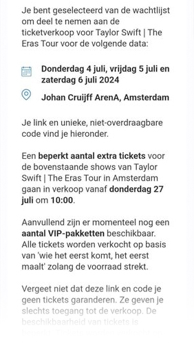 Goed nieuws! Als jij op de wachtlijst staat, heb je misschien inmiddels een mail binnen waarin staat dat er morgen, 27 juli 2023 om 10.00 uur een nieuwe verkoopronde plaatsvindt. In deze mail vind je een persoonlijke code en link om mee te doen aan deze verkoop. In de ticketverkoop zullen zowel reguliere tickets als VIP-pakketten worden verkocht.